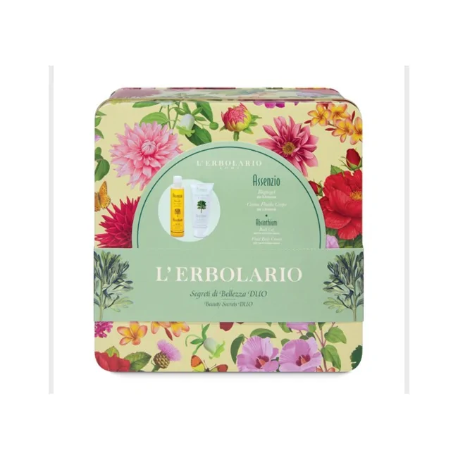 L'Erbolario Assenzio Segreti di Bellezza Duo è un elegante scatola di latta fiorita in Edizione limitata contenente Bagnogel e Crema Fluida per il Corpo.