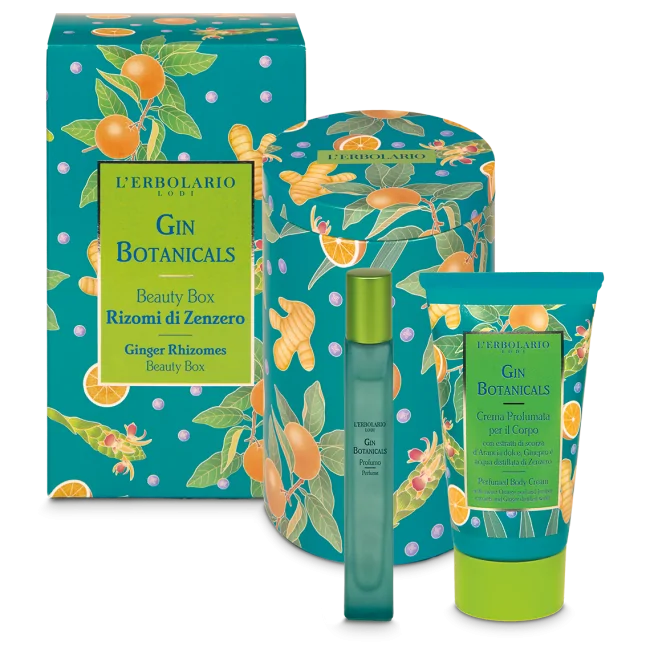 L'Erbolario Gin Botanicals Beauty Box Rizomi di Zenzero è un cofanetto in latta in Edizione Limitata contenente Crema Corpo Profumata e Profumo in formato Travel Size.