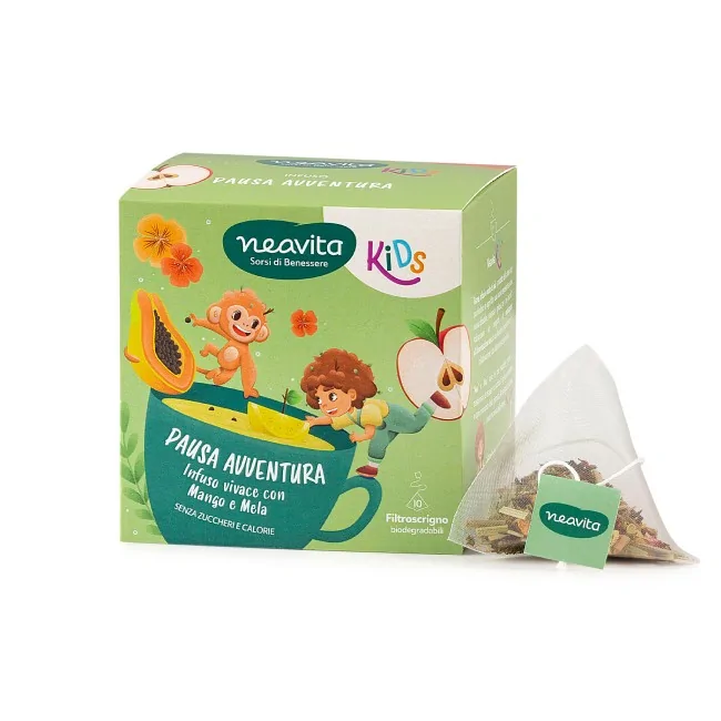 Neavita Kids Tisana Pausa Avventura è un'infuso vivace con Mango e Mela ottimo da gustare in ogni momento ma in particolare nel pomeriggio per una pausa leggera e rinfrescante.