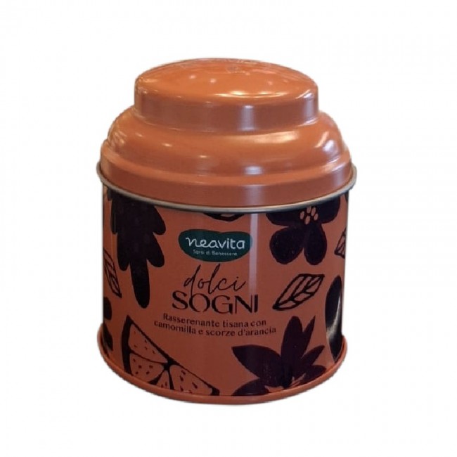Neavita Infusioni Di Benessere Barattolino Arancione Tisana Dolci Sogni è un contenitore in latta con tappo contenente una tisana rasserenante a base di camomilla e scorze di arancia.