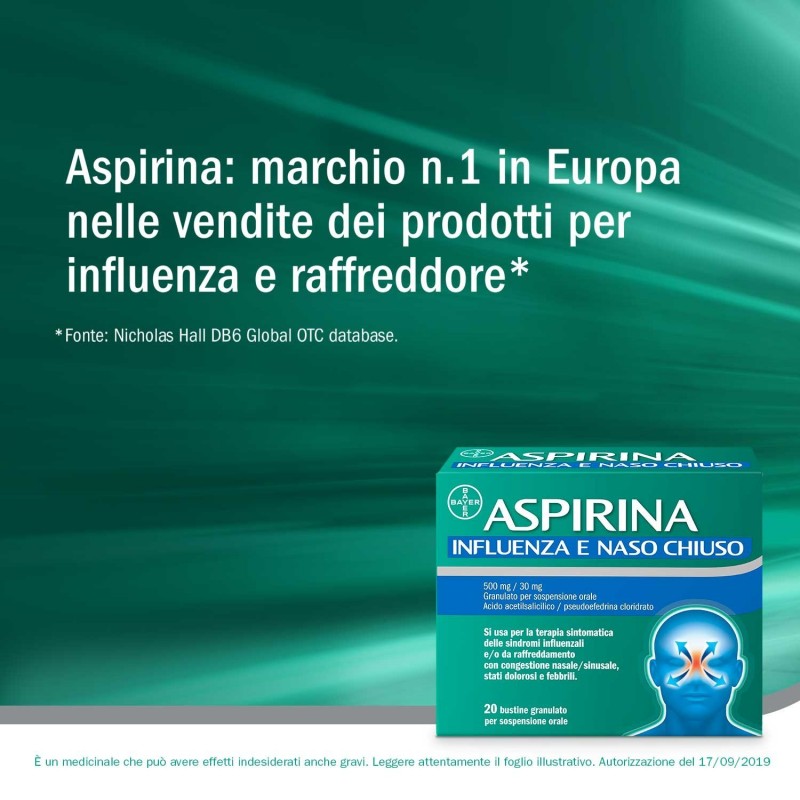 Posologia Il contenuto di 1-2 bustine per adulti e adolescenti dai 16 anni. Se necessario, è possibile ripetere la singola dose dopo un periodo di almeno 4 ore. Non superare la dose giornaliera massima di 6 bustine. Se prevale uno dei sintomi, è più appropriato il trattamento con un solo principio attivo. Aspirina influenza e naso chiuso non va assunto per più di 3 giorni senza aver prima consultato un medico. Popolazione pediatrica Aspirina influenza e naso chiuso non deve essere assunto da bambini e adolescenti di età inferiore ai 16 anni, senza consultare il medico. Data la limitata esperienza d’uso di Aspirina influenza e naso chiuso in bambini e adolescenti, non è possibile indicare una dose raccomandata specifica. Pazienti con funzionalità epatica compromessa L’acido acetilsalicilico deve essere usato con cautela in pazienti con funzionalità epatica compromessa (vedere sezione 4.4) Pazienti con funzionalità renale compromessa L’acido acetilsalicilico deve essere usato con cautela in pazienti con funzionalità renale compromessa o con circolazione cardiovascolare alterata Modo di somministrazione Aspirina influenza e naso chiuso deve essere disciolto in un bicchiere d’acqua prima dell’assunzione. La sospensione che si forma ha il sapore di arancia.