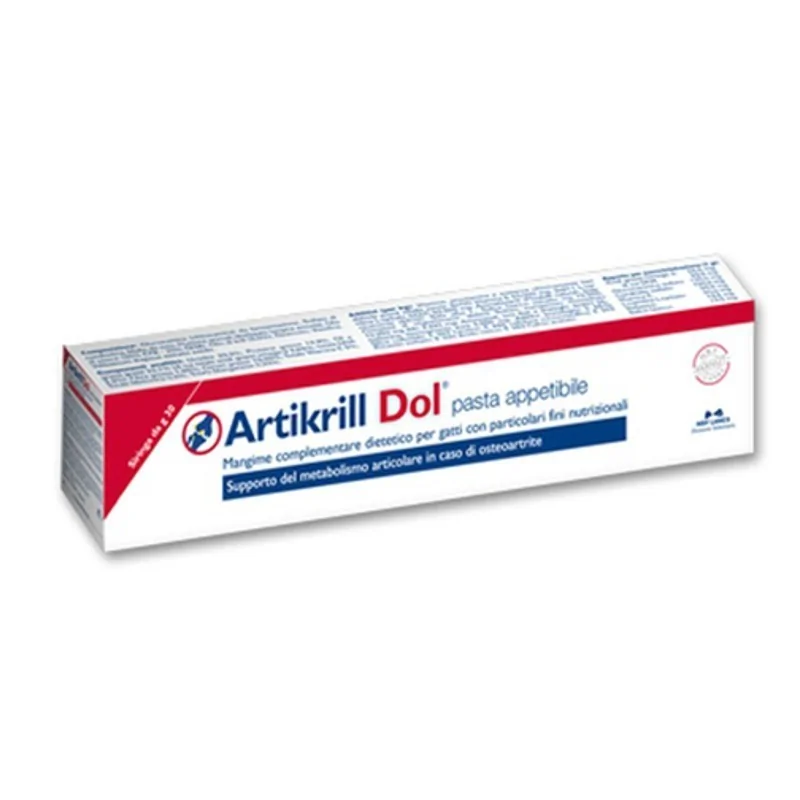 Artikrill Dol gatto è un mangime complementare dietetico formulato con acidi grassi omega- 3 (DHA) da olio di pesce, livelli più elevati di metionina e manganese e con un livello adeguato di vitamina E per il supporto del metabolismo articolare in caso di osteoartrite del gatto.
