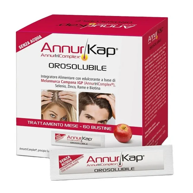 Integratore alimentare con edulcorante a base di estratto vegetale di melannurca (AnnurtriComplex), arricchito in rame, biotina, selenio da L-selenometionina e zinco. La melannurca è una varietà di mela IGP della Campania ad alto contenuto di procianidine oligomeriche. Il rame contribuisce alla normale pigmentazione dei capelli e alla protezione delle cellule dallo stress ossidativo. La biotina e il selenio contribuiscono al normale mantenimento di capelli. Il selenio contribuisce inoltre alla protezione delle cellule dallo stress ossidativo.