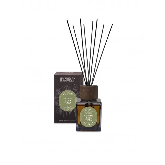 Nasoterapia Diffusore a Bastoncini Vetiver e Fava Tonka diffonde in casa una fragranza legnosa, ambrata gourmand che crea un ambiente Rilassante e Avvolgente.