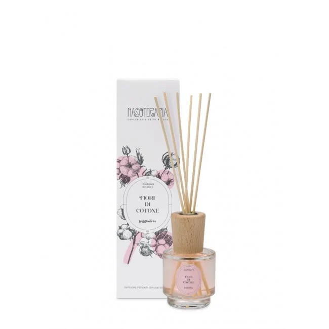 Nasoterapia Diffusore a Bastoncini Fiori di Cotone è un profumatore d'ambiente a base di oli essenziali in elegante flacone in vetro. Fragranza fresca che sa di pulito ideale per ogni ambiente della casa.