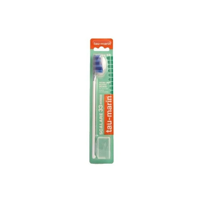Scalare 33 (Setole morbide)Specificatamente disegnato per garantire una pulizia completa della superficie dentale permettendo al tempo stesso un massaggio gengivale perfetto. Testina ellittica scalare, inclinata di 15°. Studiata per garantire una maggiore pulizia anche nei punti più difficili da raggiungere. Setole arrotondate in Tynex ad elasticità differenziata. Il materiale perfetto per evitare traumi a denti e gengive, liberando il cavo orale dai batteri e garantendo un’ottima resistenza nel tempo. Setole morbide, per rimuovere efficacemente la placca, e semirigide, per massaggiare delicatamente le gengive. Manico ergonomico studiato nella forma e nella lunghezza per una giusta impugnatura